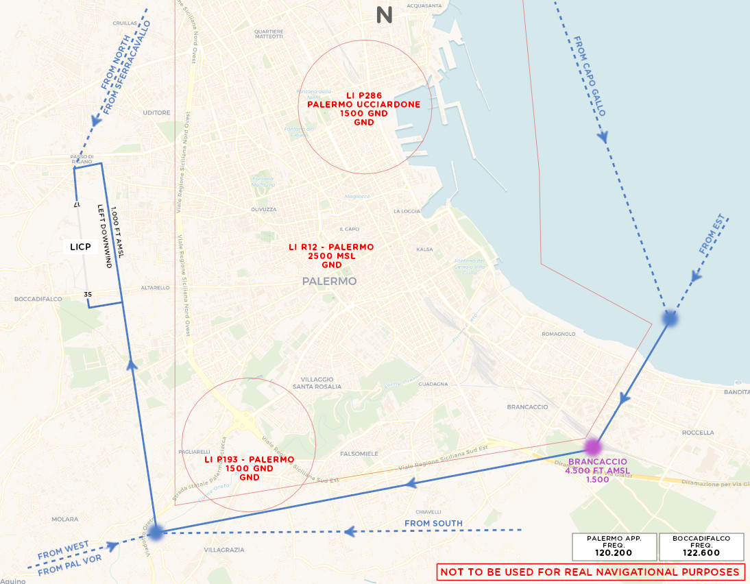 1) I traffici provenienti da NORD possono avvicinarsi al campo da Sferracavallo riportando il sottovento destro quando in vista dei traffici essenziali; In presenza di 2 traffici già in circuito procedere lungo costa in direzione del porto di Palermo per poi avvicinarsi al campo da Sud via Brancaccio (ad est della città ai piedi del Monte Grifone) ed entrare in base destra.